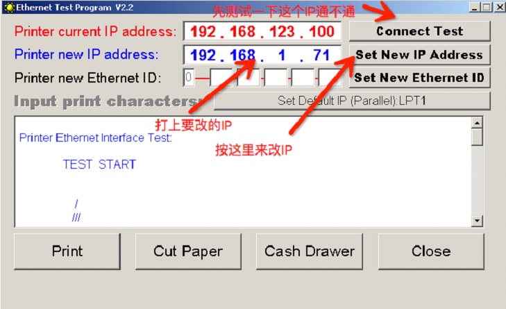 3.用ETHERNET工具去改默认IP:192.168.123.100, 改成客人现在的网络段IP:先用Connect Test测试一下这个默认IP192.168.123.100通不通,然后填上要改的IP, 按Set New IP Address进行改IP